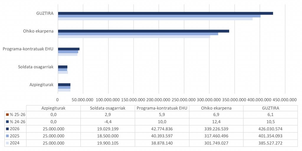 Por último, en la figura 5 se observa la evolución temporal de las aportaciones totales del Gobierno Vasco a la universidad pública en los últimos años, así como las previstas en el proyecto de Ley de presupuestos para 2026. Por tanto, no parece que la situación haya quedado intacta en los años anteriores, ni que tal cosa vaya a ocurrir en 2026.