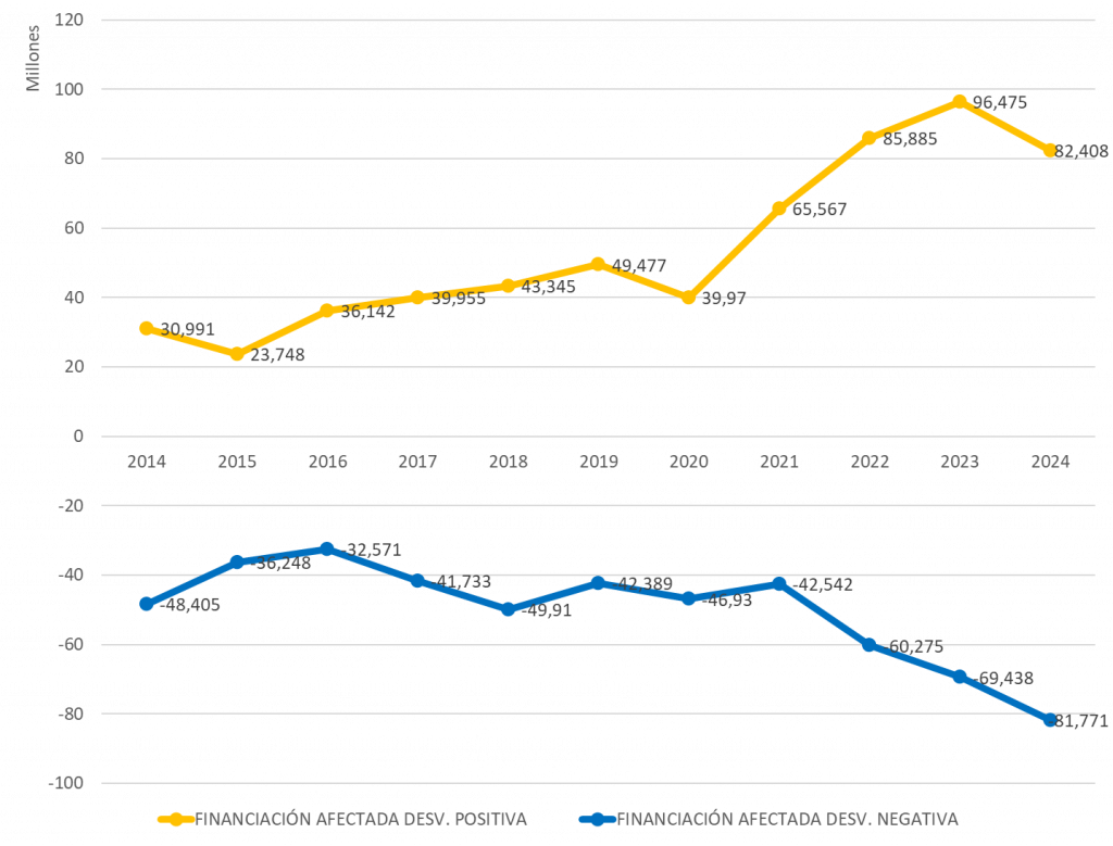 En la Figura 3 se presentan las desviaciones en la ejecución de los ingresos (línea superior) y gastos (línea inferior) con relación a las previsiones presupuestarias.