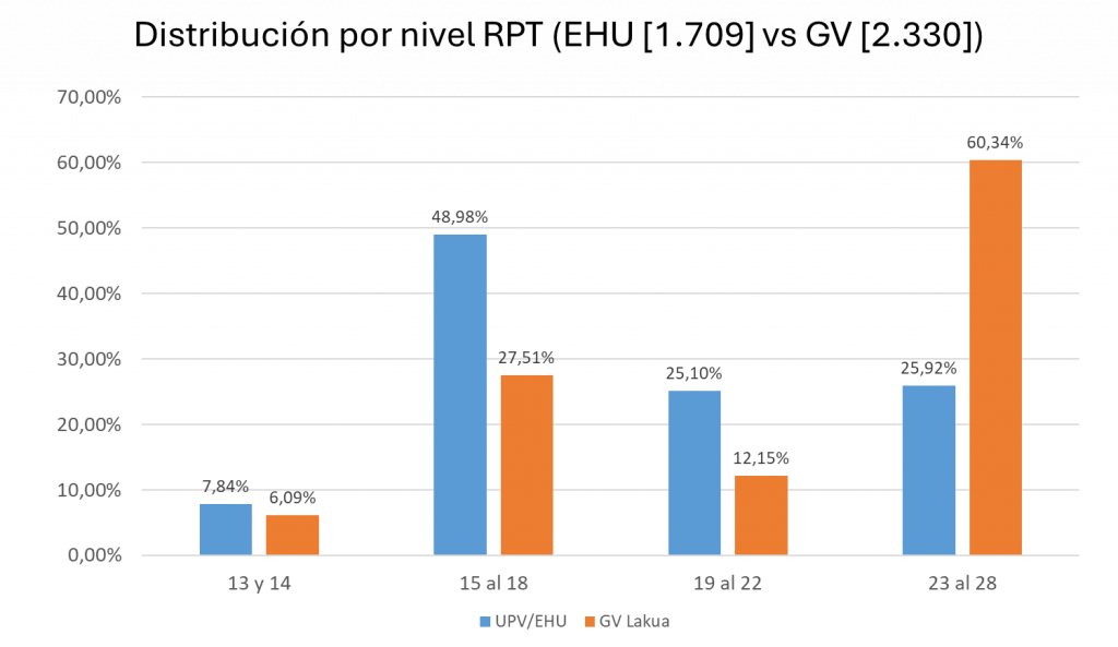 El número de puestos es diferente en las dos administraciones. Pero lo que más destaca en esa figura es la gran discrepancia entre las proporciones de puestos de alto nivel (23 a 28) en el Gobierno Vasco y en EHU, desproporción que, en sentido contrario, se produce en los niveles del 15 al 22. ¿Son acaso tan diferentes las tareas a desempeñar en una y otra institución? El personal de apoyo a la docencia y la investigación es el rasgo diferencial de EHU, pero gran parte de ese personal bien puede pertenecer a niveles relativamente altos. Y en lo que al resto de funciones se refiere, no debería haber grandes diferencias entre el personal de Lakua y el de EHU.
