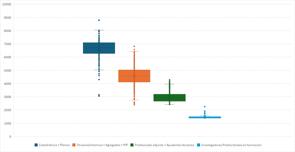 En la figura, dentro de cada rectángulo está la mitad del profesorado de cada categoría. Y entre los segmentos horizontales que se encuentran al final de la línea vertical están prácticamente todos los miembros de la categoría; las excepciones son los puntos sueltos. Los bordes superior e inferior de los polígonos rectangulares representan los límites del primer y el tercer cuartil. En otras palabras: por encima del borde superior, y hasta el segmento al final de la línea vertical, se encuentra el 25% del profesorado de la categoría. Y por debajo del límite inferior, se encuentra otro 25%.