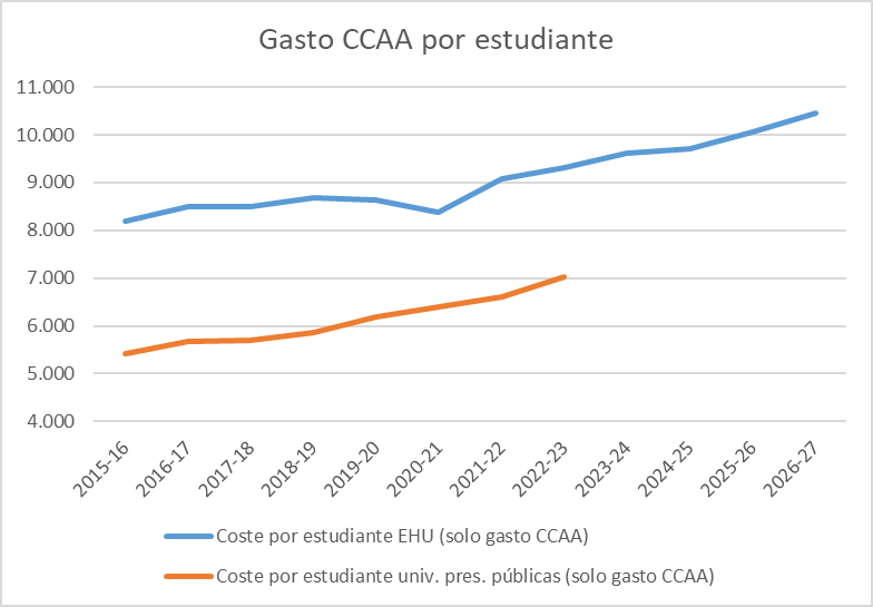 En la primera figura se representa la variación del gasto (€/estudiante) que han realizado las comunidades autónomas (en azul, la CAV; en naranja, el conjunto de las CCAA del Estado) en la última década, y se ha incluido la previsión para los ejercicios de 2025 y 2026 en nuestra comunidad autónoma. La fuente de los datos, hasta 2022 ha sido el SIIU (Servicio Integrado de Información Universitaria, del MCIU) y, a partir de 2023, las liquidaciones presupuestarias o las previsiones para las liquidaciones de 2025 y 2026.