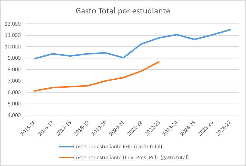 Otra forma de hacer comparaciones es expresar el gasto en función del número de estudiantes. Al fin y al cabo, son los y las estudiantes los destinatarios inmediatos de la actividad universitaria. También la investigación está vinculada a la actividad docente cuyos destinatarios son ellos y ellas.