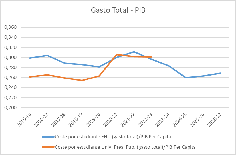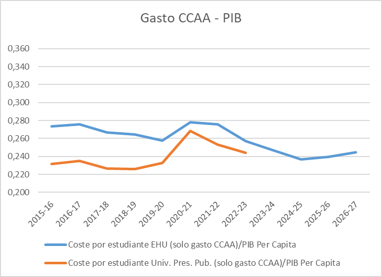 En el debate acerca de la financiación de EHU se ha recurrido en numerosas ocasiones al porcentaje que representa el gasto público dedicado a financiar las universidades públicas con relación al PIB. Y se ha llegado a afirmar que la LOSU obliga a las comunidades autónomas a destinar un volumen de recursos del 1% del PIB a financiar sus universidades públicas.