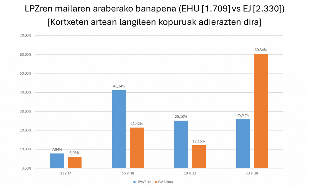 Lanpostu kopurua desberdina da bi administrazioetan. Baina irudi horretan gehien nabarmentzen dena Eusko Jaurlaritzan ( % 60) eta EHUn ( % 26) dauden goi-mailako (23tik 28ra) lanpostuen proportzioen arteko aldea da. Desproportzio hori, aurkako zentzuan, 15etik 22ra bitarteko mailetan gertatzen da. Erakunde batean eta bestean egin beharreko zereginak hain desberdinak al dira? Irakaskuntzan eta ikerketan laguntzeko langileak dira EHUren ezaugarri bereizgarriak, baina langile horietako asko nahiko maila garaietakoak izan daitezke. Eta gainerako funtzioei dagokienez, ez litzateke alde handirik egon beharko Lakuako eta EHUko langileen artean.
