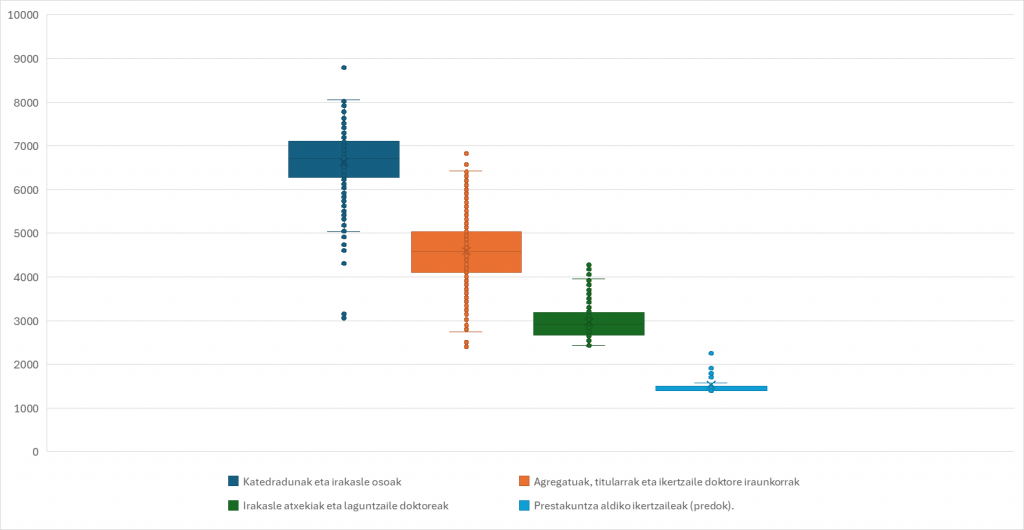 Kasu guztietan, 2025eko iraileko ordainsari gordinak dira. Oinarrizko soldataren datuak unibertsitateko errektoretzak bere dokumentuan aurkezten dituenak dira. Kuartilei dagozkienak unibertsitateak berak Eusko Jaurlaritzari emandako informaziotik abiatuta kalkulatu dira. P25 taldeak adierazten du kategoria horren irakasleen % 25ak taulan adierazitako kopurua baino gutxiago jasotzen duela; P50 taldeak adierazten du talde horretako kideen erdiek adierazitako kopurua baino gehiago jasotzen dutela eta beste hainbestek kopuru txikiagoak jasotzen dituztela; eta P75 taldeak adierazten du % 25ek adierazitako kopurua baino gehiago jasotzen dutela.