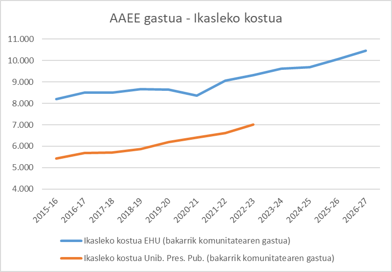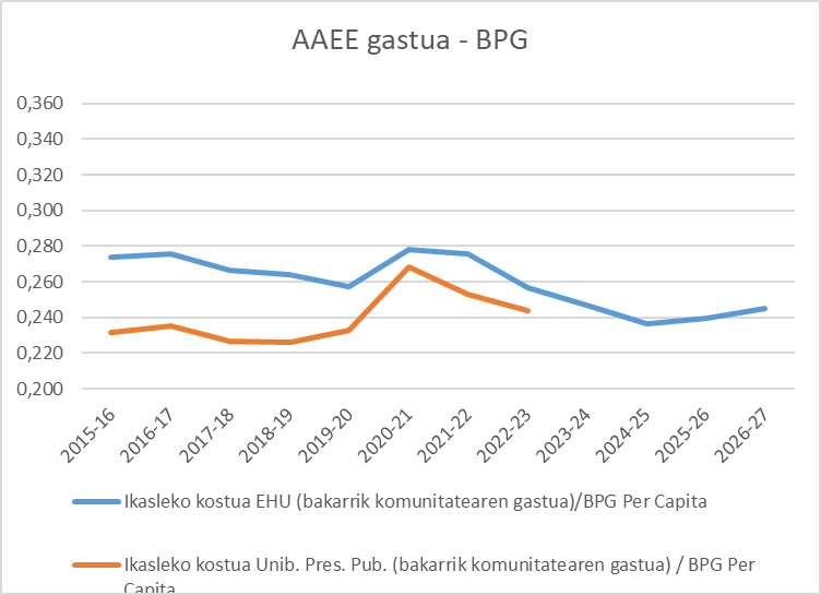 Lehenengo irudian, azken hamarkadan autonomia-erkidegoek (urdinez, EAEk; laranjaz, Estatuko autonomia-erkidegoek) egindako gastuaren aldaketa (€/ikasle) adierazten da, eta gure autonomia-erkidegoan 2025eko eta 2026ko ekitaldietarako aurreikuspena sartu da. Datuen iturria, 2022ra arte, SIIU (Unibertsitate Informazioko Zerbitzu Integratua, MCIU) izan da, eta 2023tik aurrera, aurrekontu-likidazioak edo 2025eko eta 2026ko likidazioetarako aurreikuspenak.